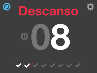 8 rondas de: 20 Trabajo / :10 Descanso hasta 8 ejercicios con color, animación y refuerzo con sonido
