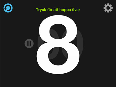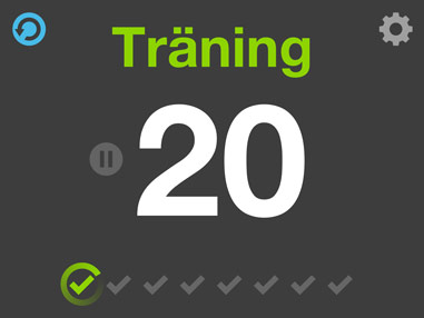 8 rundor med 20s Träning / 10s Vila för upp till 8 pass, med färg, animation och ljudförstärkning