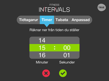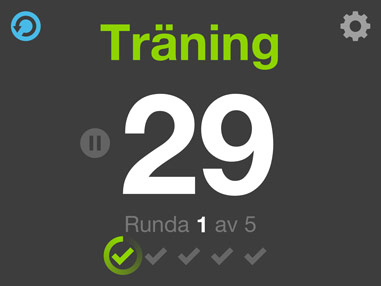 Du ställer in träning-/viloperioder och antalet rundor med färg, animation och ljudförstärkning